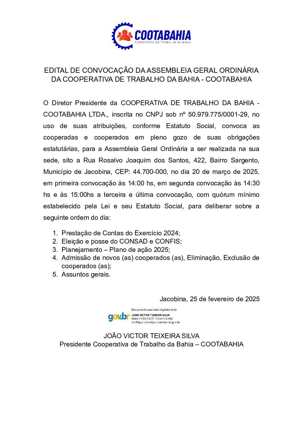 O Diretor Presidente da COOPERATIVA DE TRABALHO DA BAHIA – COOTABAHIA LTDA., inscrita no CNPJ sob nº 50.979.775/0001-29, no uso de suas atribuições, conforme Estatuto Social, convoca as cooperadas e cooperados em pleno gozo de suas obrigações estatutárias, para a Assembleia Geral Ordinária a ser realizada na sua sede, sito a Rua Rosalvo Joaquim dos Santos, 422, Bairro Sargento, Município de Jacobina, CEP: 44.700-000, no dia 20 de março de 2025, em primeira convocação às 14:00 hs, em segunda convocação às 14:30 hs e às 15:00hs a terceira e última convocação, com quórum mínimo estabelecido pela Lei e seu Estatuto Social, para deliberar sobre a seguinte ordem do dia: