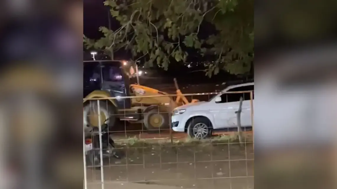 Em imagens registradas por populares que estavam no local, é possível acompanhar quando a máquina arrasta carros e motos enquanto algumas pessoas correm, aos gritos, para longe do equipamento de terraplenagem. Um dos automóveis atingidos chega a capotar na via.