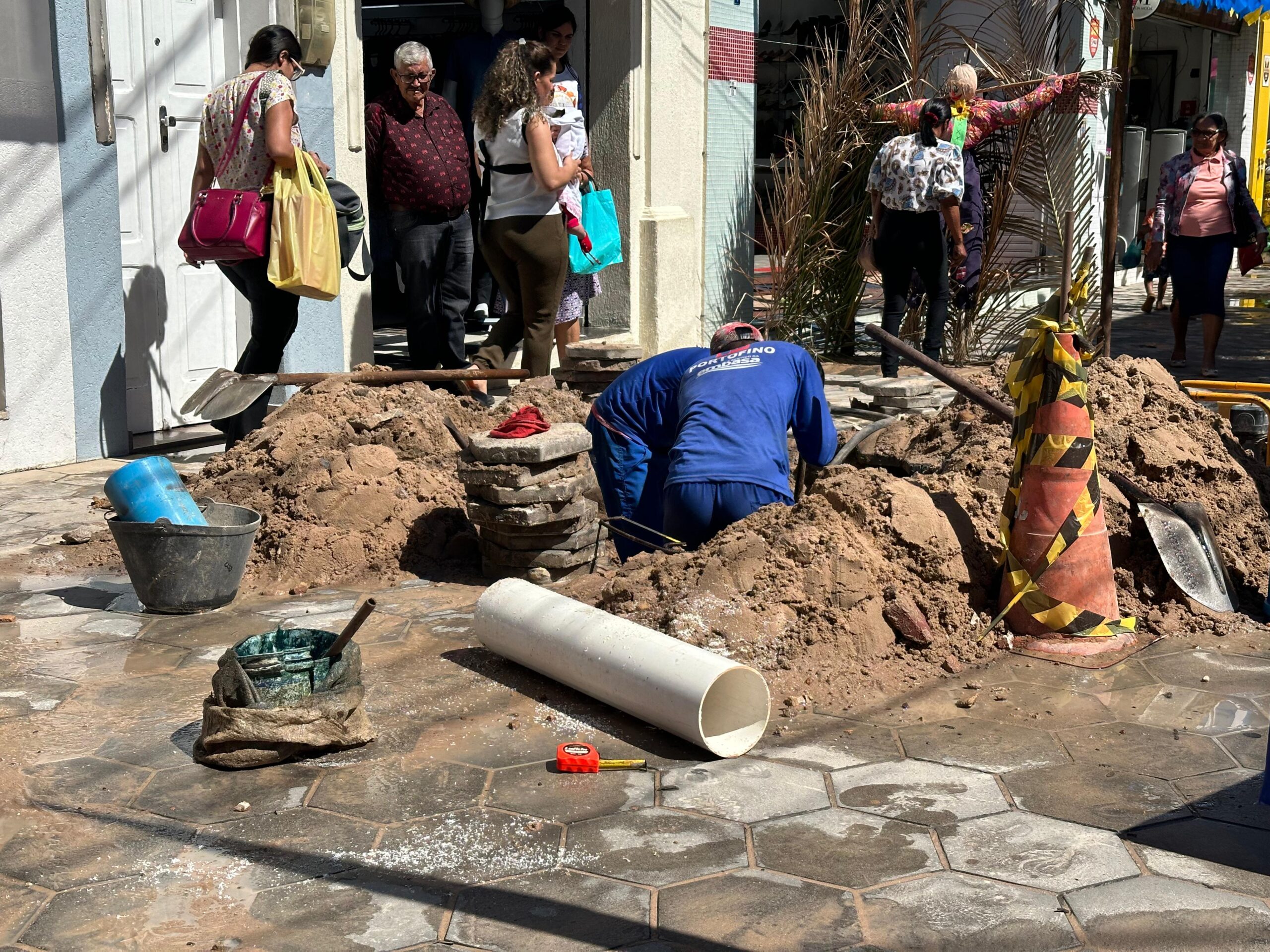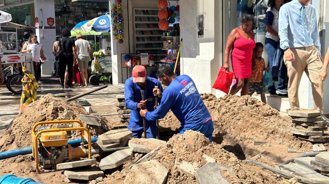 Nesta sexta-feira (28), prepostos da Empresa Baiana de Águas e Saneamento (Embasa) estão realizando a manutenção de uma rede de água no Calçadão de Jacobina. A intervenção tornou-se necessária após o rompimento de um cano na área, ocorrido desde ontem.